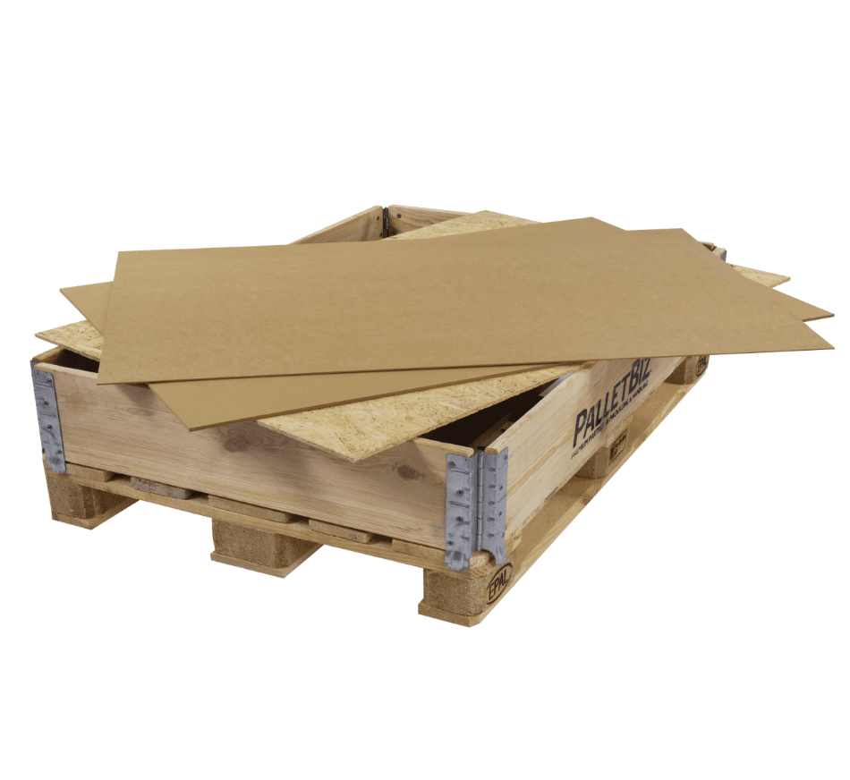 Lids and Covers are made of HDF, MDF or OSB, and are placed either on the pallet itself under the pallet collar, or on top of the pallet collar. They serve to prevent cargo pieces falling through the pallet gaps (with pallet covers), or to cover the pallet with its pallet collar and create a box effect (with pallet collar lids).