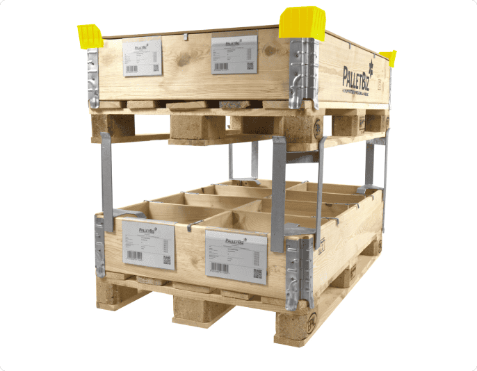 Distanțierele sunt suporturi metalice care pot fi fixate pe colțurile colierelor de palet. Acestea creează un mediu cu mai multe stive, lăsând spațiu între colierele de palet și paletul de deasupra.