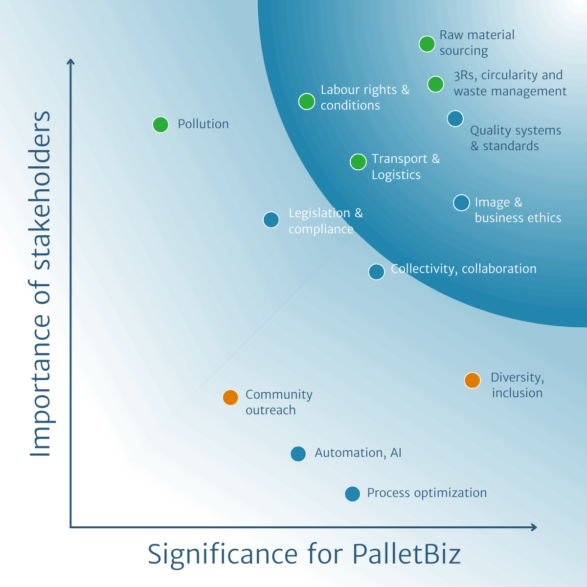 Având în vedere că PalletBiz activează într-o industrie care depinde în mare măsură de abundența materialelor brute de calitate (în special lemn), precum și de alte resurse precum energie, resurse fosile și apă, recunoaștem că trebuie să gestionăm strategic impactul nostru asupra mediului și al construcțiilor sociale respective.